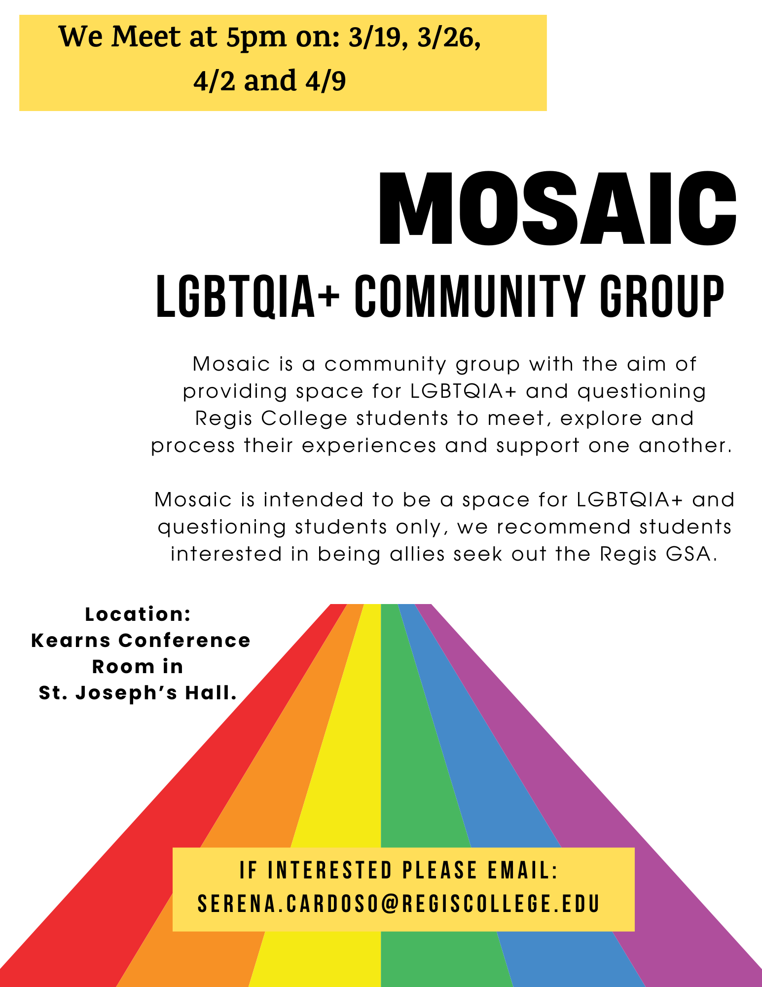 MOSAIC is a therapeutic group with the aim of providing space for LGBTQIA+ and questioning Regis students to meet, explore and process their experiences and support one another.